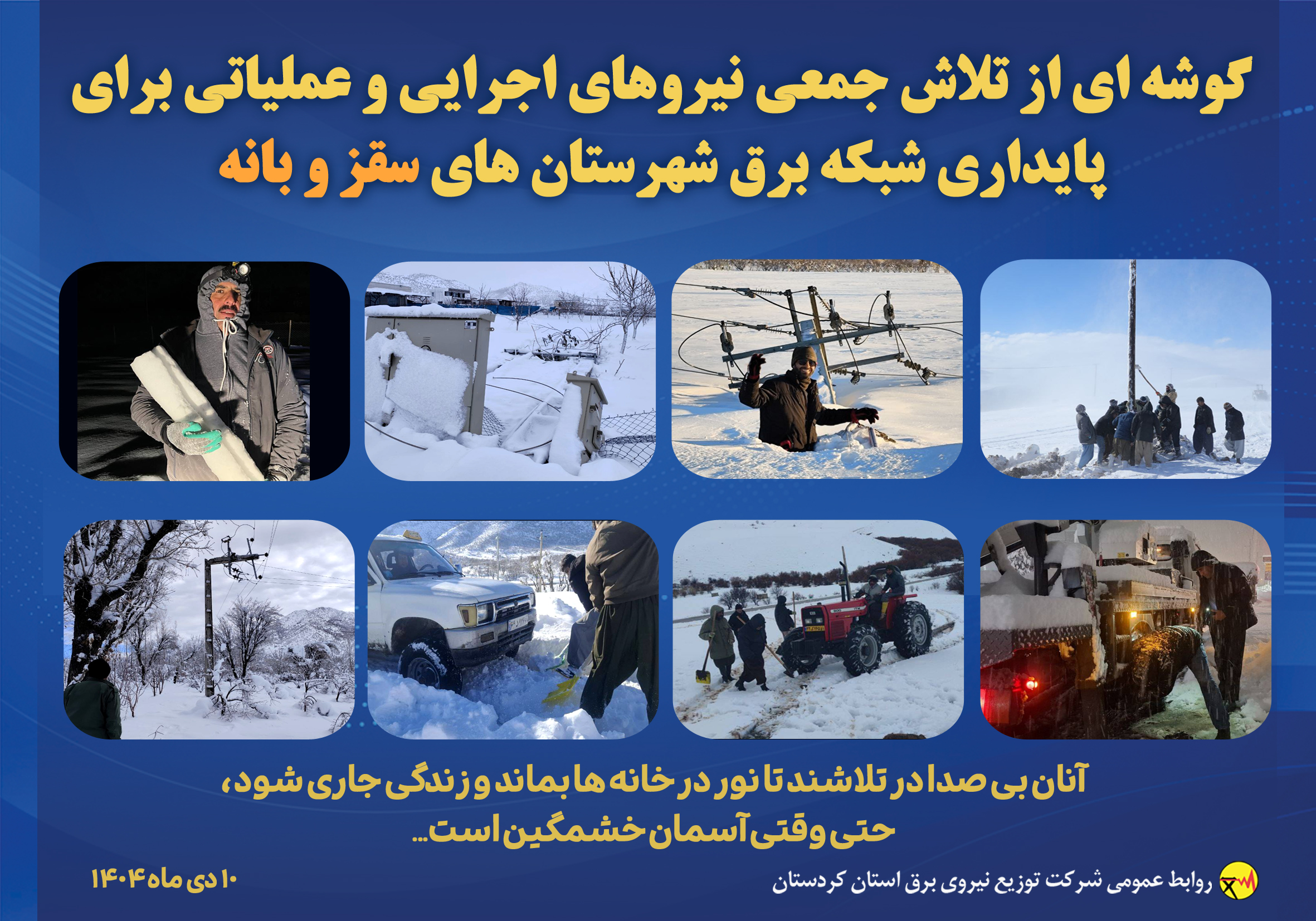 مدیرعامل شرکت توزیع نیروی برق استان کردستان اعلام کرد: در جریان بحران ناشی از بارش مداوم و سنگین برف و کولاک از هفتم تا دوازدهم دیماه، با تلاش شبانهروزی اکیپهای عملیاتی، کلیه روستاهای شهرستان سقز اکنون برقدار شده و به شبکه سراسری برق متصل هستند. به گزارش روابط عمومی شرکت…